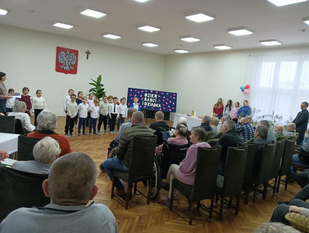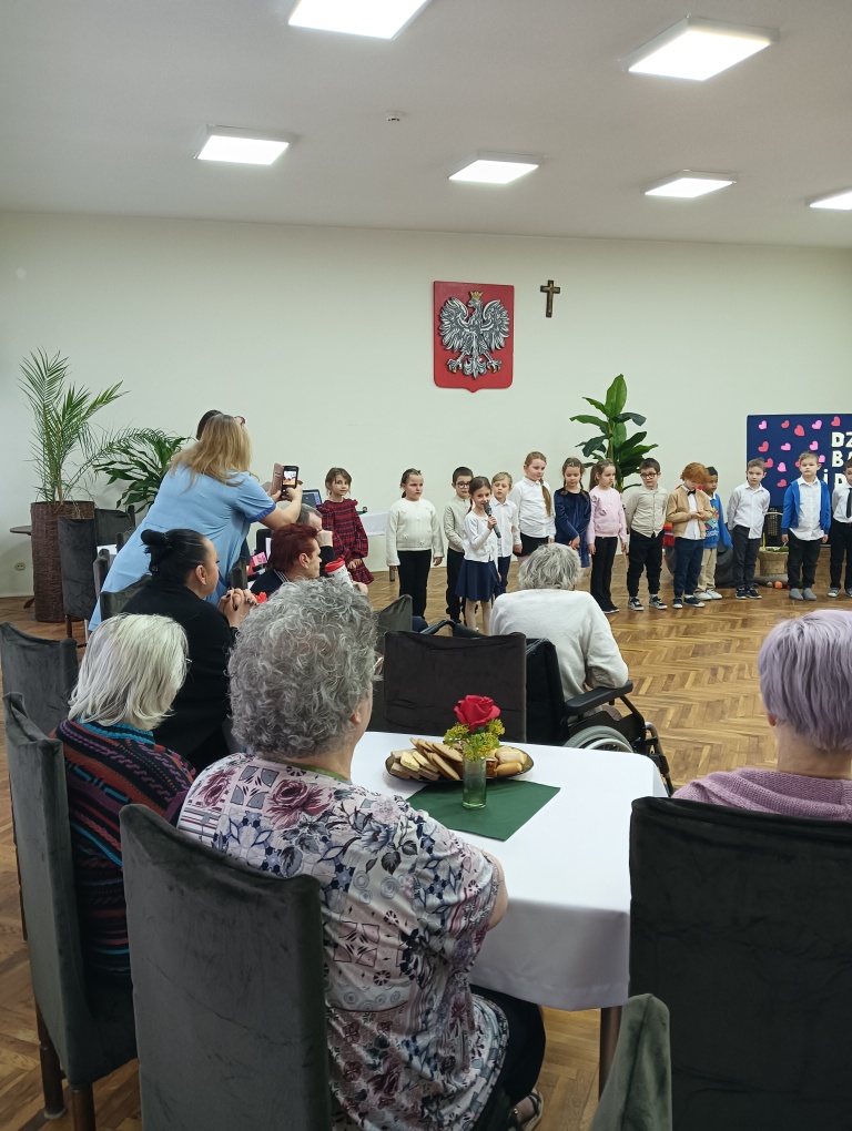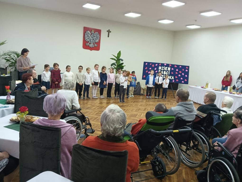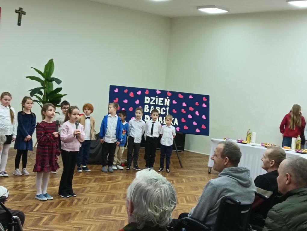 W dniu 23 stycznia 2026r. klasa 1a pod opieką p.Kasi i p. Moniki, świętowała Dzień Babci i Dziadka razem z mieszkańcami DPS przy ul. Farbiarskiej. Dzieci pięknie śpiewały i recytowały wierszyki i życzenia, aż w nie jednym oku zakręciła się łezka . Po występie dzieci wręczyły własnoręcznie wykonane karty okolicznościowe, a w podziękowaniu jedna z Babć poczęstowała dzieci cukierkami.